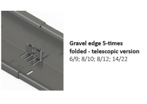 Το τηλεσκοπικό όριο περιμετρικής στήριξης GT GBT χρησιμοποιείται για τον διαχωρισμό διαφορετικών υλικών (υπόστρωμα, χαλίκι κ.λπ.) και μπορεί να χρησιμοποιηθεί ως σταθερή περιμετρική στήριξη για στέγες με ελαφρά κλίση. Το προφίλ περιμετρικής στήριξης τοποθετείται απευθείας πάνω στη μεμβράνη στεγανοποίησης ή πάνω σε ένα προστατευτικό γεωύφασμα, χωρίς να στερεώνεται μέσω της μεμβράνης στεγανοποίησης.