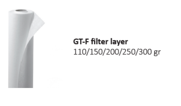 Τα γεωυφάσματα GT GF είναι κατασκευασμένα από θερμικά επεξεργασμένες ίνες που χρησιμοποιούνται ως διαχωριστικό στρώμα ή στρώμα φίλτρου σε πολυεπίπεδα συστήματα πράσινων στεγών. Η κατακόρυφη διαπερατότητα του νερού επιτρέπει την αποστράγγιση του μέσω της κατασκευής της πράσινης στέγης.