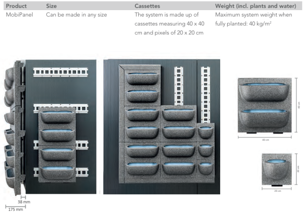 Το σύστημα κάθετων φυτικών τοίχων MobiPanel είναι η τελευταία γενιά κάθετου πρασίνου από την Mobilane. Έχει αναπτυχθεί ειδικά για να κάνει την μελλοντικά βιώσιμη και ανθεκτική κατασκευή ακόμα πιο προσιτή. Αυτό το μοναδικό, μοντέρνο και μονάδικό σύστημα κάθετων φυτικών τοίχων, με τις ανταλλάξιμες φυτικές κασέτες σε δύο μεγέθη, επιτρέπει να δώσετε μια βιώσιμη και ζωντανή εμφάνιση σε επίπεδους και κυρτούς τοίχους.