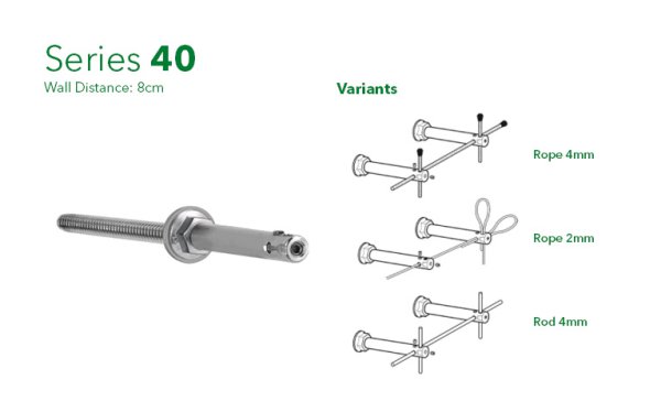 Σειρά 40 / 40.8 - Η μικρότερη έκδοση με απόσταση τοίχου 4cm, η Σειρά 40 είναι κατάλληλη για ύψη έως 2,5 μέτρα. Η Σειρά 40 διατίθεται επίσης σε απόσταση τοίχου 8cm, ιδανική για φυτά ύψους έως 8m .
