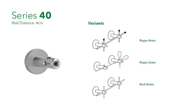 Σειρά 40 / 40.8 - Η μικρότερη έκδοση με απόσταση τοίχου 4cm, η Σειρά 40 είναι κατάλληλη για ύψη έως 2,5 μέτρα. Η Σειρά 40 διατίθεται επίσης σε απόσταση τοίχου 8cm, ιδανική για φυτά ύψους έως 8m .